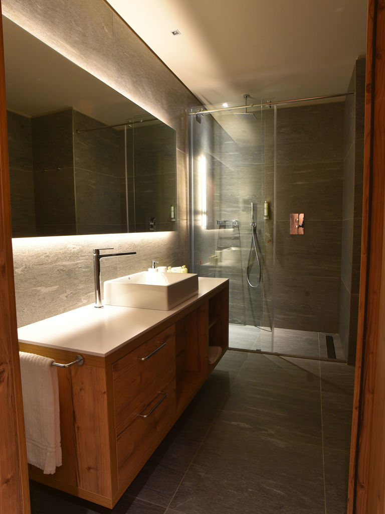 Il balcone privato attrezzato regala una vista panoramica sulle montagne circostanti, perfetto per immergersi nella quiete della natura. Gli arredi in stile alpino contemporaneo, realizzati con materiali naturali come legno e pietra, ti faranno sentire le calde atmosfere di una vera baita di montagna.